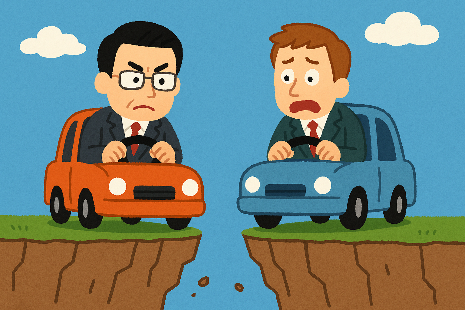 チキンレースとは何か:今回の騒動の始まり😏 私ランディ君。君は「チキンレース」という言葉を知っているかい。車で崖に向かって走り、どちらが先にハンドルを切るかを競う、あの無茶な勝負だ。💬 ランディ君はい、危険回避の意思決定を比較するゲーム理論...